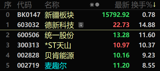换手率前5位:德新科技(603032)14.88%、统一股份(600506)11.60%、*ST天山(300313)10.37%、贝肯能源(002828)9.23%、麦趣尔(002719)8.55%。
