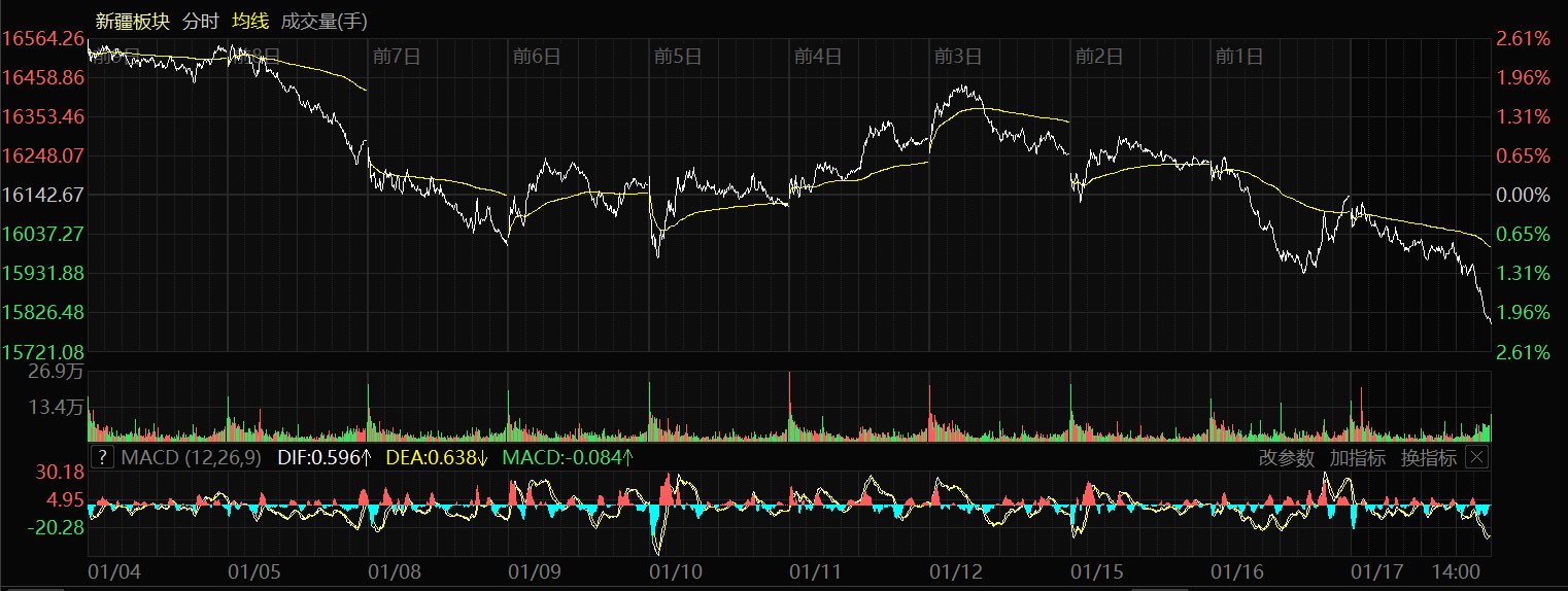 天山网-新疆日报讯(记者冉虎报道)1月17日收盘时,新疆板块指数15792.92,跌幅2.17%;当日3只股票上涨,57只股票下跌,0只股票平盘,上涨率5%;当日总换手率0.78%,总成交额61.40亿元。