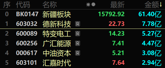 成交额前5位:德新科技(603032)7.78亿元、特变电工(600089)5.27亿元、广汇能源(600256)4.47亿元、中油资本(000617)3.08亿元、汇嘉时代(603101)2.94亿元。