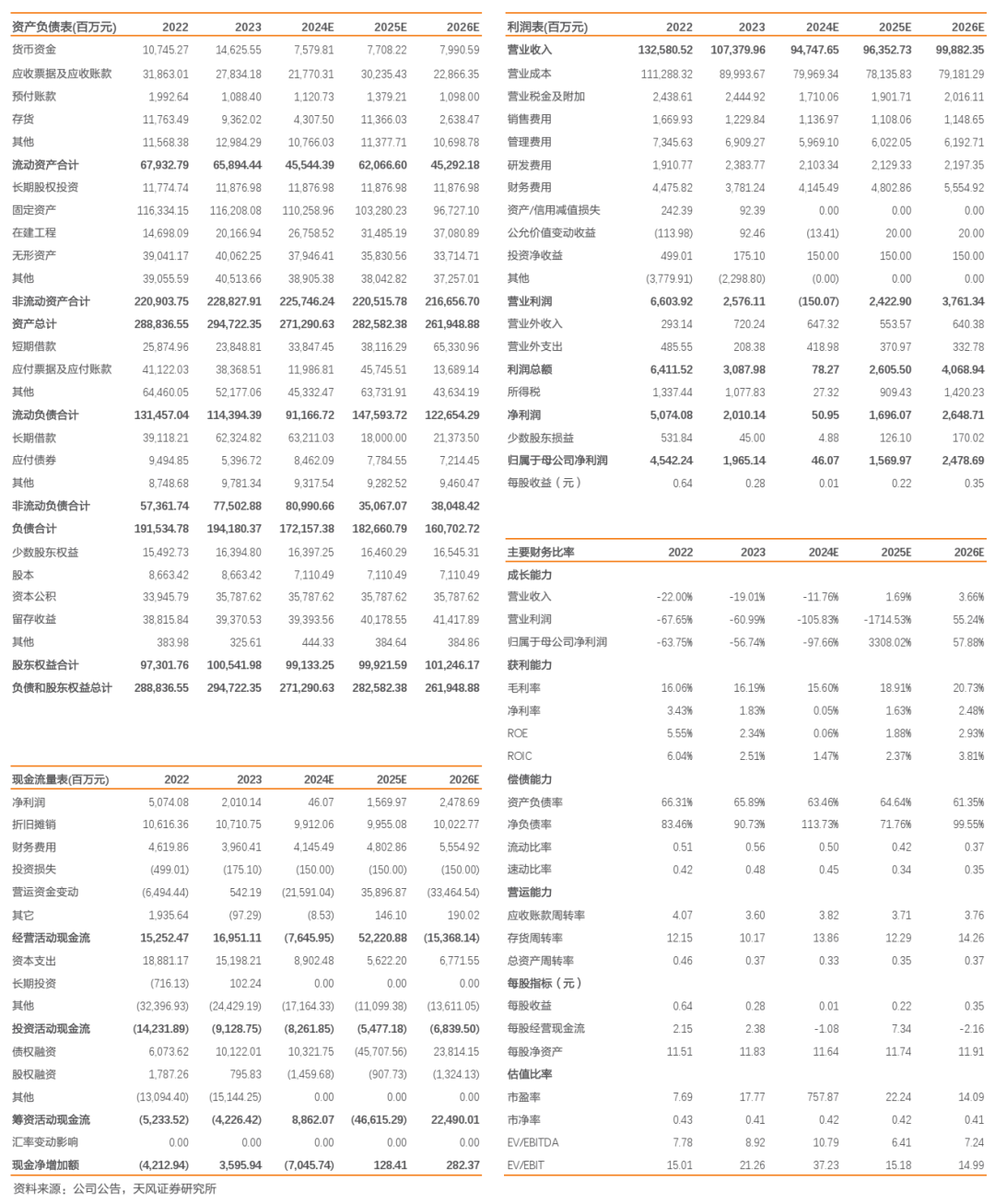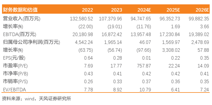 公司具备规模优势,若需求出现好转,产能利用率的提升有望带动成本优化,盈利存较大恢复弹性。考虑到公司上半年盈利承压较大,下调24-26年归母净利润为0.5/15.7/24.8亿元(前值为21.6/24.4/26.5亿元),参考可比公司,给予公司24年0.55倍PB,对应目标价6.40元,维持“买入”评级。