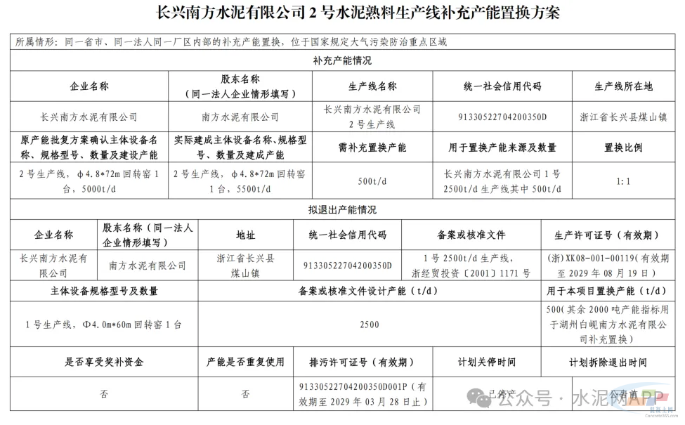 长兴南方水泥2号线置换补充产能500t/d;