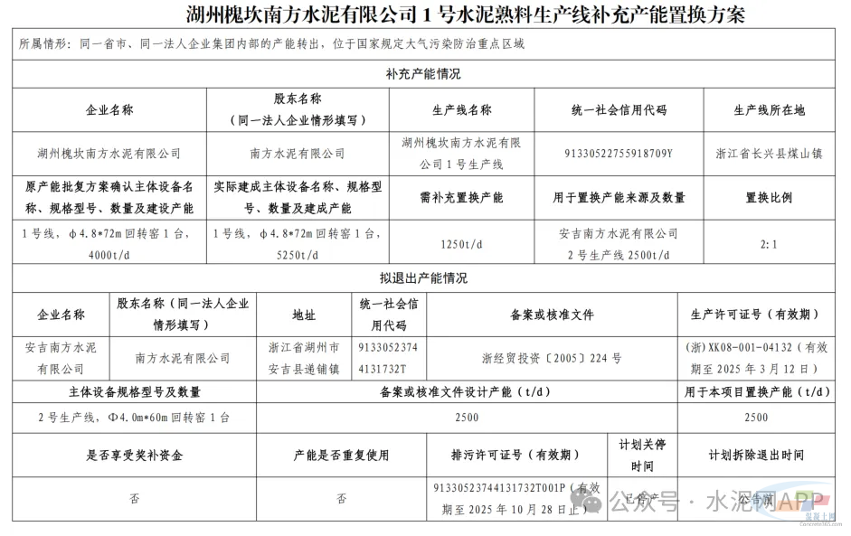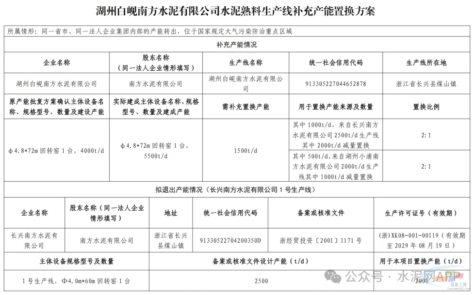 湖州白岘南方水泥置换补充产能1500t/d。