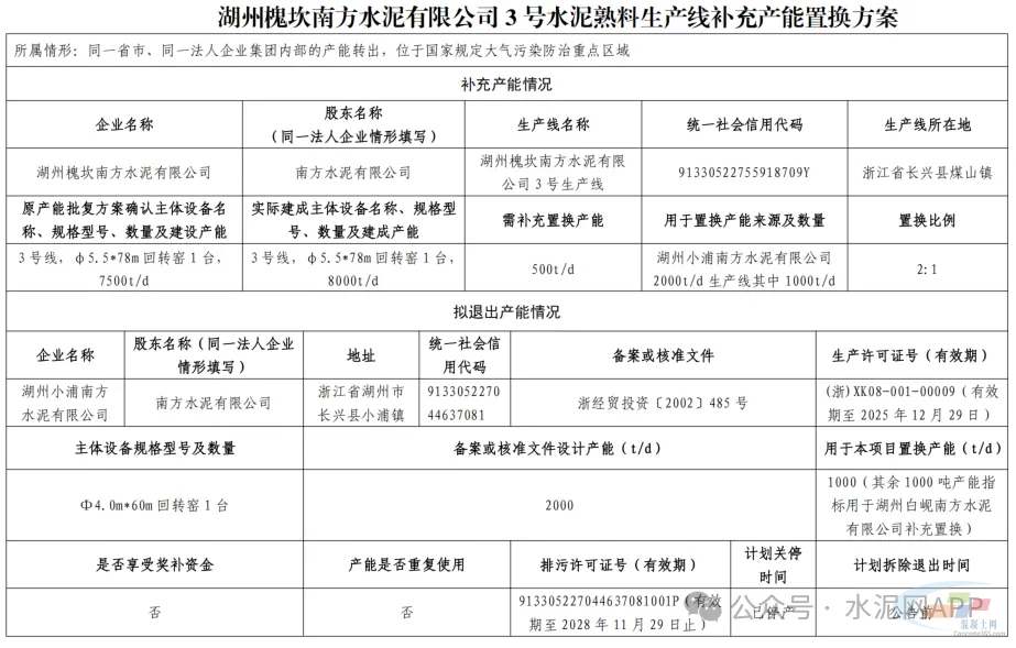 湖州槐坎南方水泥3号线置换补充产能500t/d;