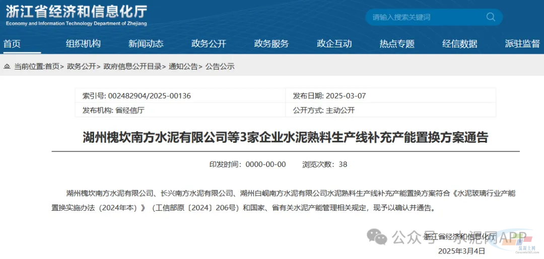 3月7日,浙江省经信厅发布“湖州槐坎南方水泥有限公司等3家企业水泥熟料生产线补充产能置换方案通告”。