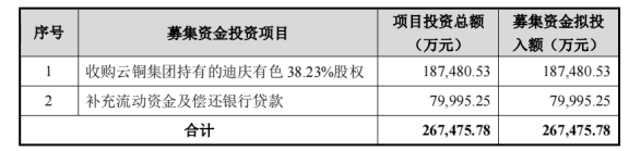 本次非公开发行股票拟募集资金总额(含发行费用)不超过26.75亿元,扣除发行费用后的募集资金净额拟全部投入以下项目:收购云铜集团持有的迪庆有色38.23%股权、补充流动资金及偿还银行贷款。