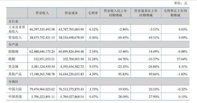 云南铜业2024年上半年营收及毛利率情况。截图自云南铜业2024年半年报