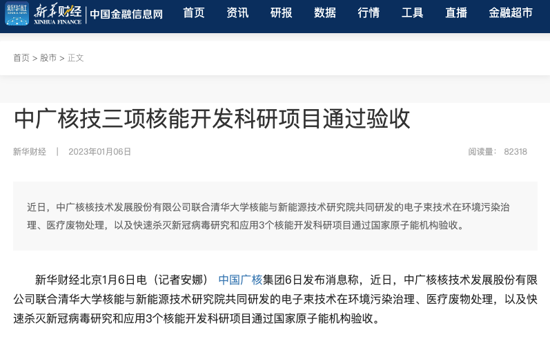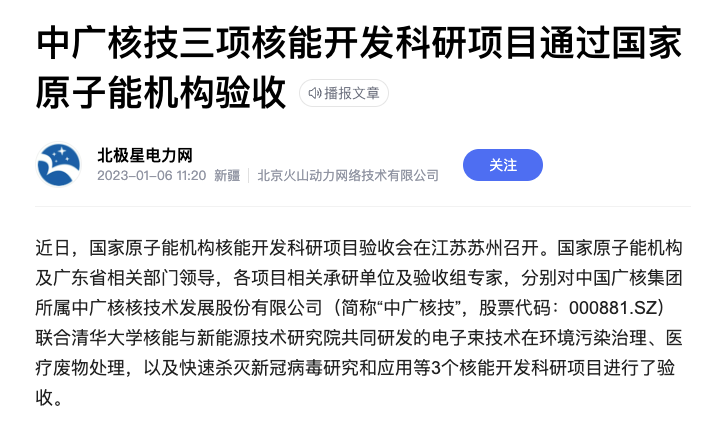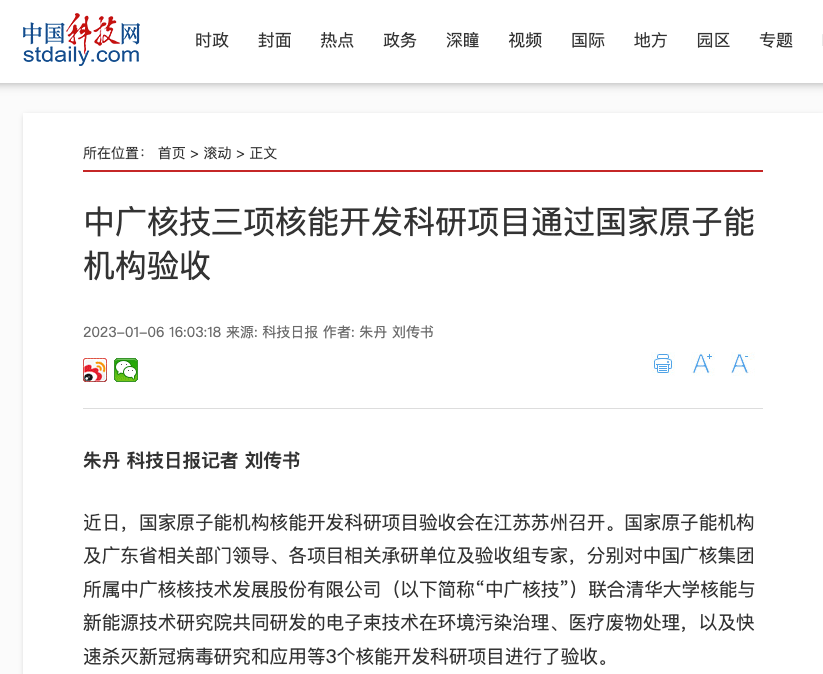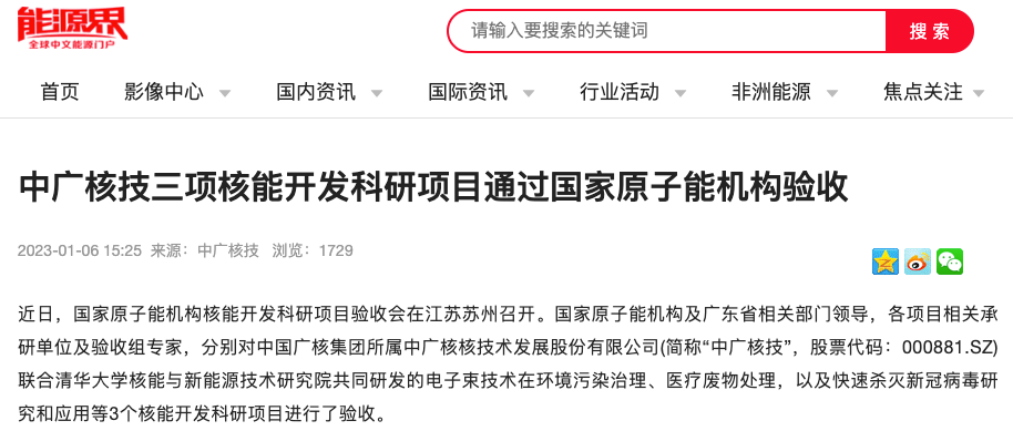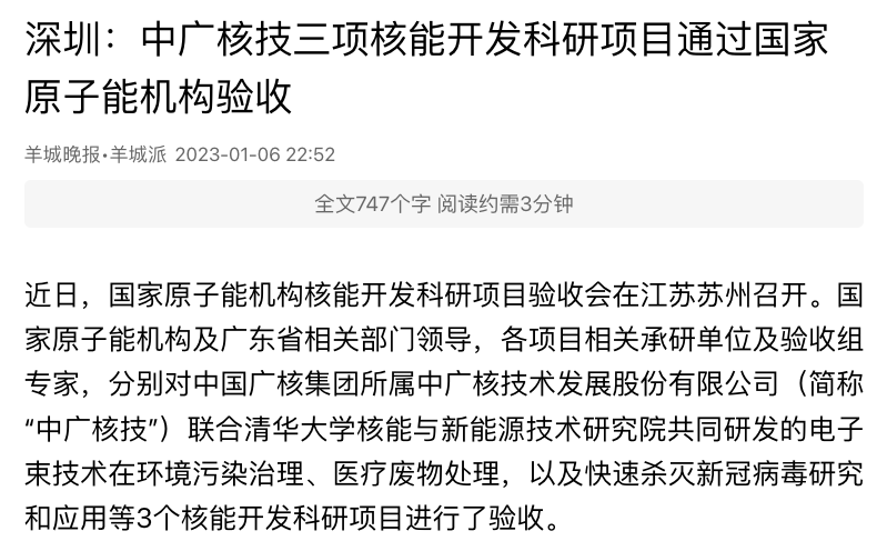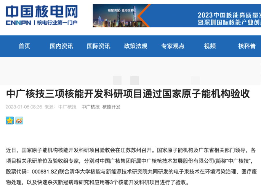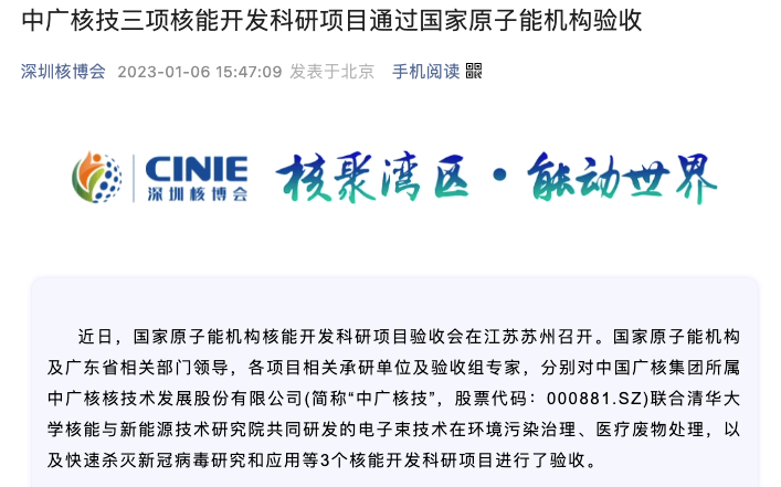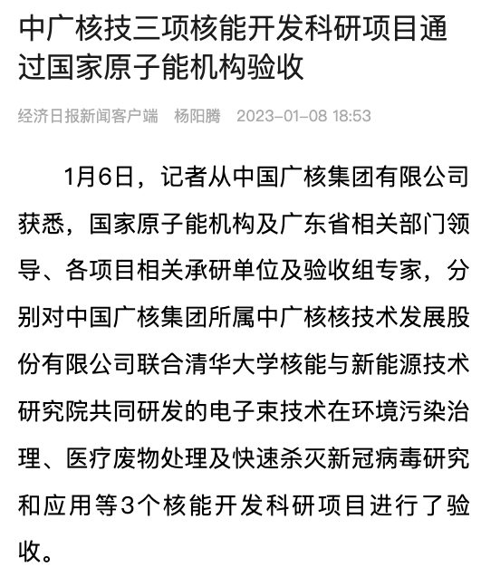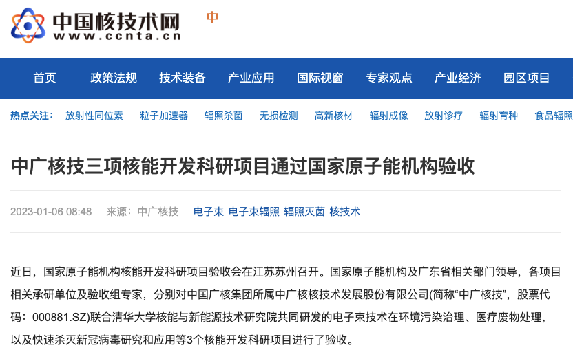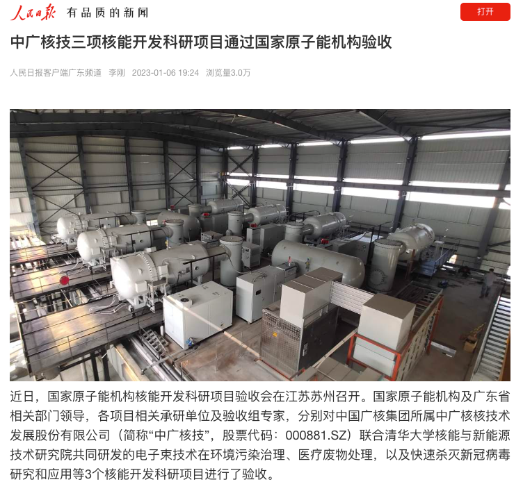 近日,中广核技联合清华大学核能与新能源技术研究院共同研发的电子束技术在环境污染治理、医疗废物处理,以及快速杀灭新冠病毒研究和应用等3个核能开发科研项目通过国家原子能机构验收。