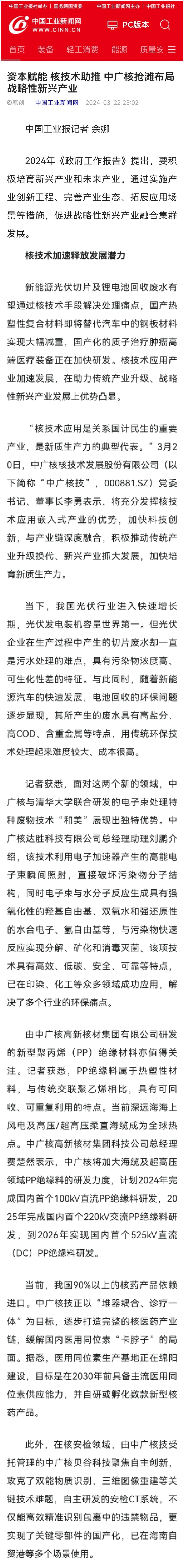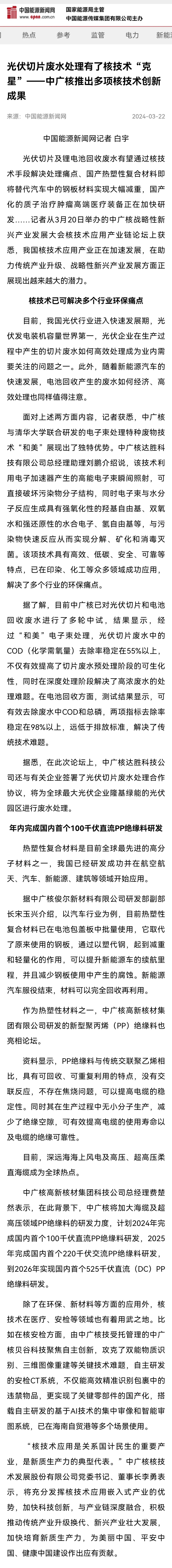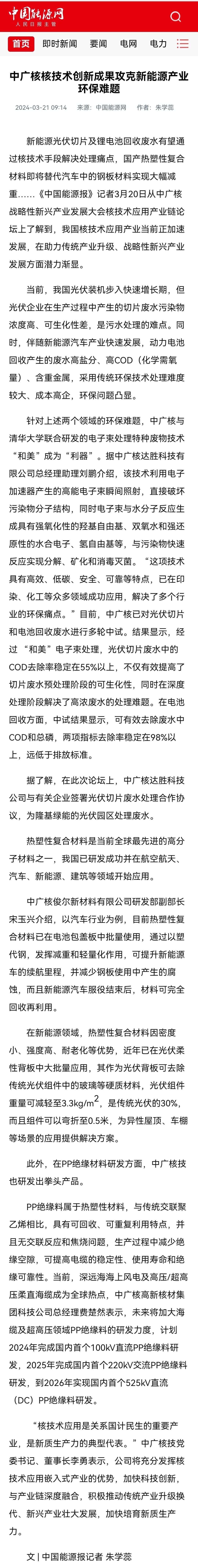 新能源光伏切片及锂电池回收废水有望通过核技术手段解决处理痛点,国产热塑性复合材料即将替代汽车中的钢板材料实现大幅减重,国产化的质子治疗肿瘤高端医疗装备正在加快研发……