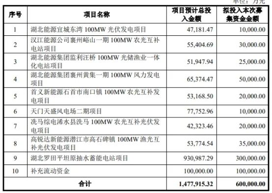 湖北能源于2023年9月14日披露关于向不特定对象发行可转换公司债券募集说明书(申报稿),公司本次原拟发行的可转债所募集资金总额不超过600,000.00万元(含),扣除发行费用后将全部用于超700MW风光项目投资以及补充流动资金。