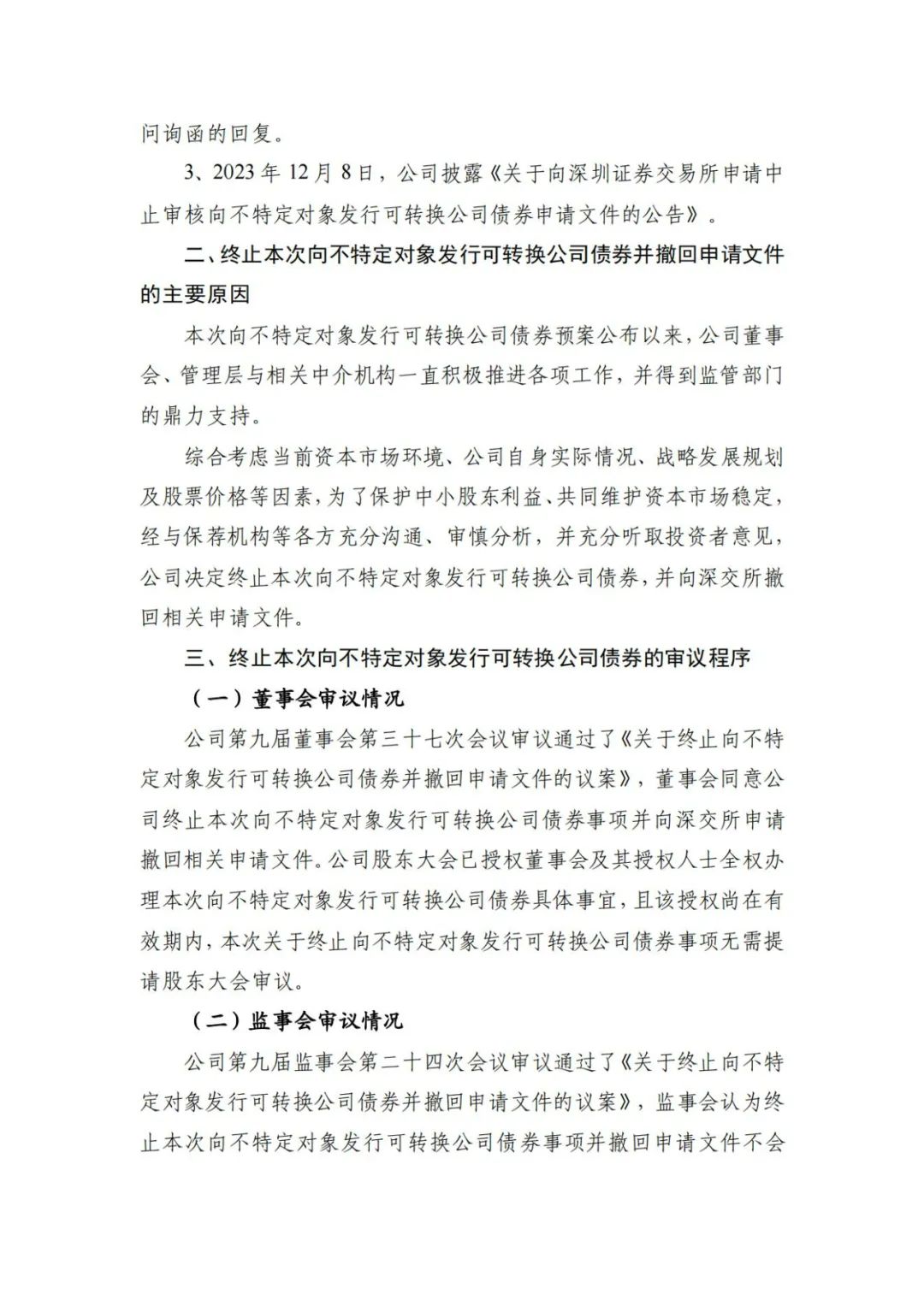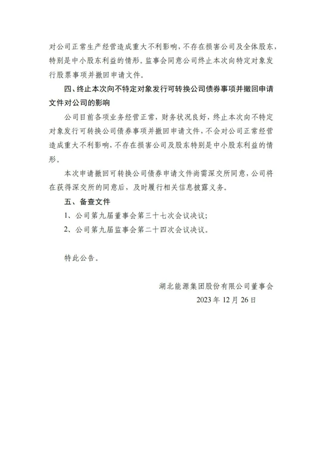 2023年12月26日,湖北能源和保荐人华泰联合证券有限责任公司、长江证券承销保荐有限公司向深交所提交了《湖北能源集团股份有限公司关于撤回向不特定对象发行可转换公司债券的申请》和《华泰联合证券有限责任公司关于撤回湖北能源集团股份有限公司向不特定对象发行可转换公司债券的申请》《长江证券承销保荐有限公司关于撤回湖北能源集团股份有限公司向不特定对象发行可转换公司债券的申请》,申请撤回申请文件。根据《深圳证券交易所上市公司证券发行上市审核规则》第二十条、《深圳证券交易所股票发行上市审核规则》第六十二条的有关规定,深交所决定终止对湖北能源申请向不特定对象发行可转换公司债券的审核。