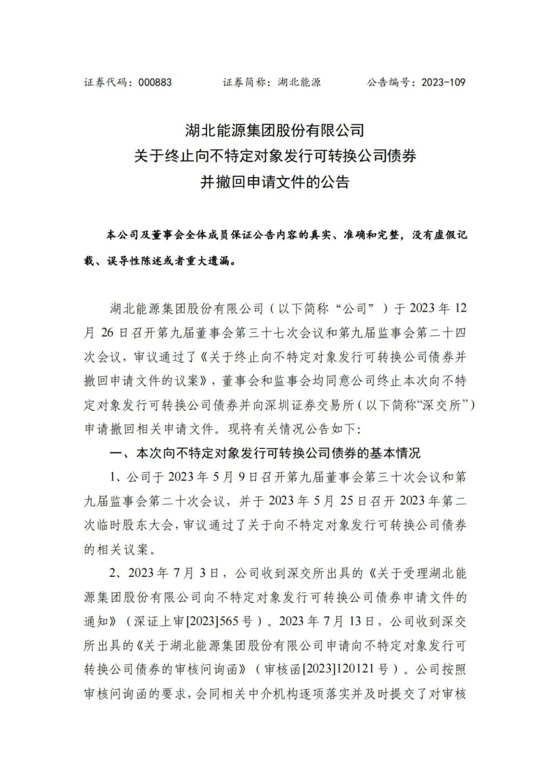 12月27日,湖北能源发布《关于终止向不特定对象发行可转换公司债券并撤回申请文件的公告》,终止超700MW风光项目、约60亿元的可转债申请。