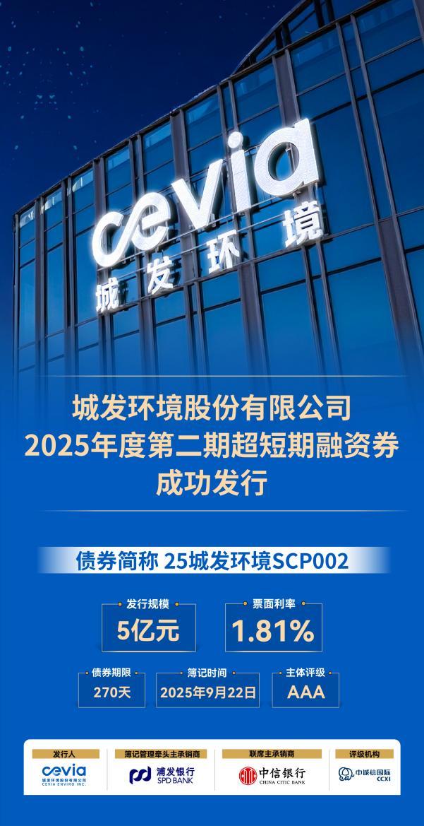 9月23日,大河财立方记者从城发环境股份有限公司(以下简称“城发环境”或“公司”,股票代码:000885.SZ)获悉,该公司2025年度第二期超短期融资券的簿记发行工作已圆满完成。本期超短期融资券发行规模5亿元,期限270天,最终票面利率1.81%。牵头主承销商和簿记管理人为上海浦东发展银行股份有限公司,联席主承销商为中信银行股份有限公司。