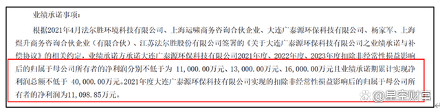 法尔胜披露称,广泰源拥有十几项核心技术专利,在垃圾渗透液治理领域拥有丰富经验和相关技术。对方更是承诺,2021、2022和2023扣非净利不低于1.1亿、1.3亿和1.6亿,且累计不低于4亿元。2021年,广泰源实现扣非净利约1.11亿,踩线过关。