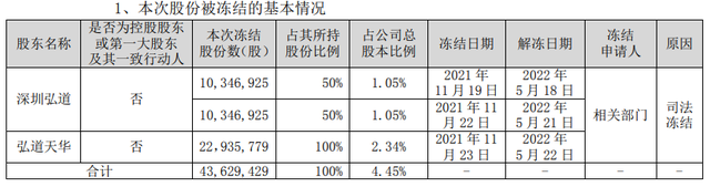 11月25日晚间,欢瑞世纪发布公告称,公司近日通过中国证券登记结算有限责任公司深圳分公司查询获知,公司股东深圳弘道天瑞投资有限责任公司、弘道天华(天津)资产管理合伙企业(有限合伙)(以下简称“深圳弘道”“弘道天华”)所持有的本公司股份被司法冻结。本次冻结股份数4362.94万股,占公司总股本比例4.45%。