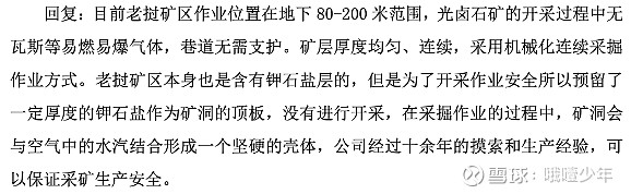 2、是否会引发安全事故?根据公司此前披露情况,公司开采作业保留了钾石盐作为顶板,加上上述提到的区别于煤矿,煤矿需要加支护作为支撑,所以煤矿井下相对狭窄,而钾盐矿由于有顶板及矿柱,是不需要打支护的,井下也相对空旷,只不过亚钾与俄钾因为钾盐矿类别不同,所以会有颜色上的差异,采掘区都是相对空旷的。在采掘面发生安全事故的可能性较低,很难出现类似于国内煤矿企业的重大透水事故的情况。