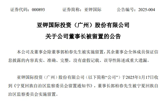 亚钾国际(000893.SZ)近日再次成为市场焦点。1月17日,公司公告称董事长郭柏春被宁夏回族自治区监察委员会实施留置,这是郭柏春一年内第二次遭遇此类事件。消息一出,亚钾国际股价应声下跌,截至1月18日收盘,公司股价报16.64元/股,较前一交易日下跌17.01%。