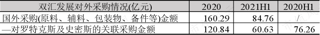 2021年上半年,双汇发展向包括史密斯在内的关联方采购了60.63亿元的分割肉、分体肉等,占当期国外采购总金额的71.53%。