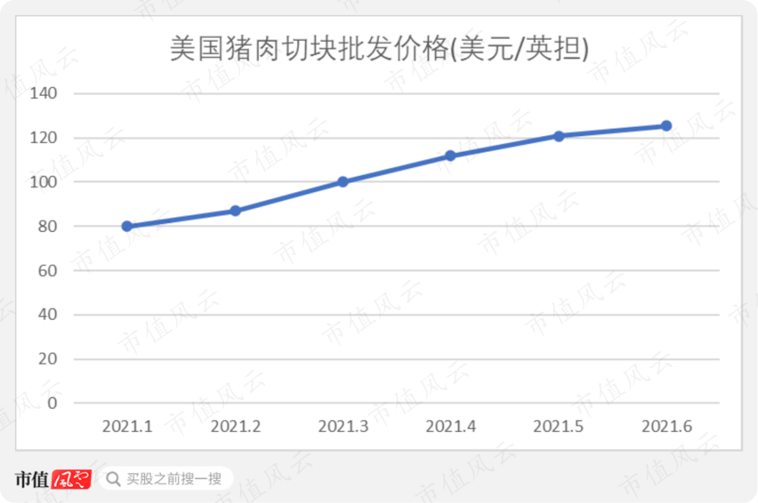 相反,美国的猪肉价格不降反升。2021年6月,美国的猪肉切块批发价从今年1月的80美元/英担一路上涨至125.5美元/英担。