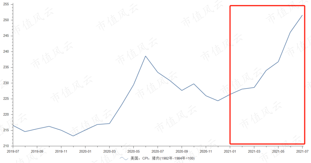 (红框内为2021年以来美国的猪肉CPI指数变动情况,来源:choice数据)