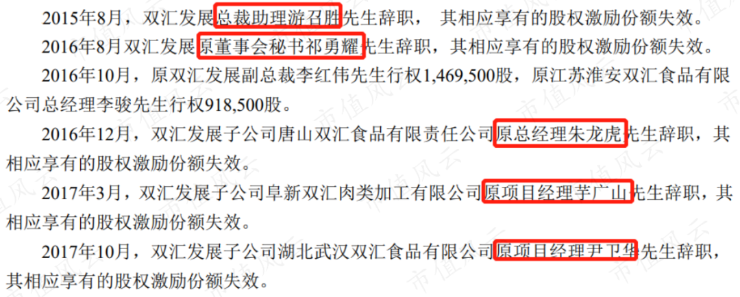 第二点,在2020年报里双汇发展透露该股权激励计划中有多位授予对象因离职丧失了相应的激励份额。
