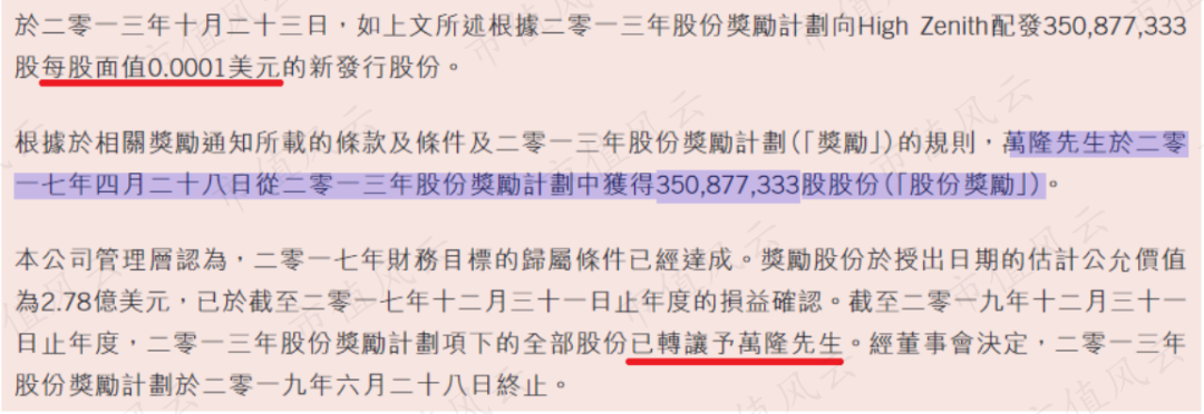 2017年万隆领取的薪酬确实因受让了3.5亿股万洲国际股票显得异常地高,而风云君找遍了万洲国际的公告,也未能找到公司明确公布的股权转让达成条件。