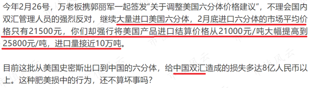 万洪建在自己撰文、接受新浪采访时透露出,今年万隆与郭丽军将美国史密斯出口至双汇发展的六分体价格提价,导致双汇发展出现近8亿元亏损。