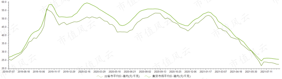 然而,在今年1~6月间,国内猪肉价格迎来一阵暴跌,22省市平均猪肉价格从2021年1月3日的48.83元/kg急降至21.7元/kg(2021.6.27)。