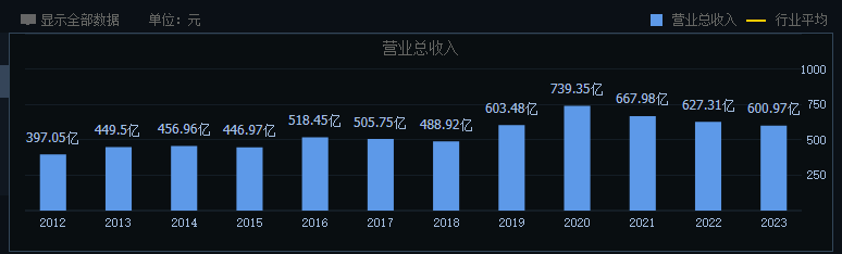 近几年,双汇发展“屠宰+肉制品”两大主业增长均陷入困境,导致公司营收陷入滞涨的境地。数据显示,2020年,双汇发展营业总收入达到739.35亿元,此后便一路下滑。2021年-2022年,双汇发展营收规模分别为667.98亿元、627.31亿元,同比降幅分别为-9.65%、-6.09%。至2023年,双汇发展营收已经是连续第三年出现同比缩水。