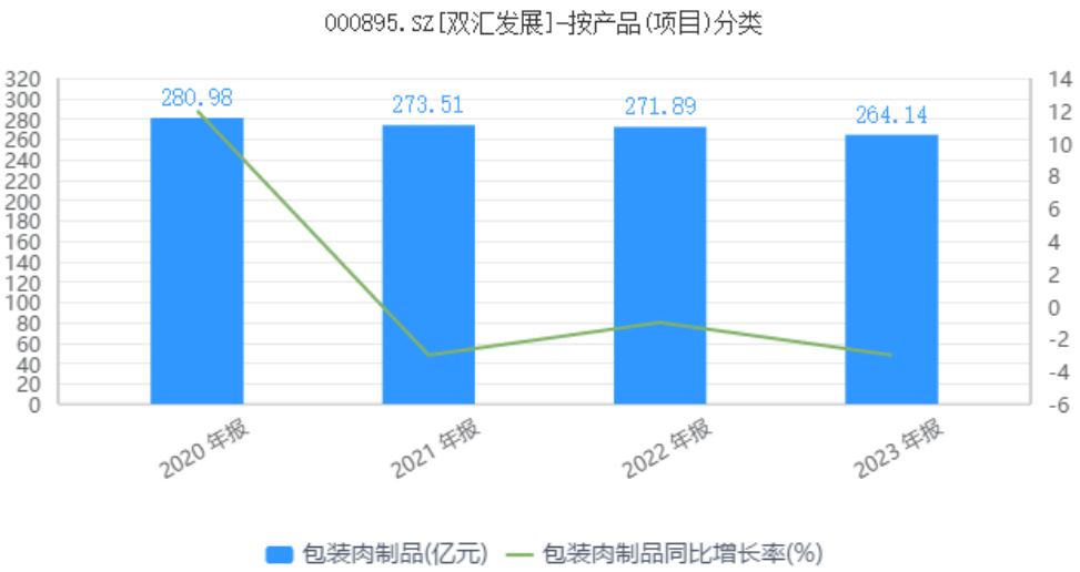 肉制品方面,由于国人生活水平的提高及健康饮食的需求,双汇发展火腿肠等传统产品已经不再受到欢迎。数据显示,2020年-2023年,双汇发展肉制品销售量分别为159万吨、156万吨、156万吨和151万吨,销售收入分别为280.98亿元、273.51亿元、271.89亿元和264.14亿元,销售量和销售金额均处于逐年下滑的趋势。