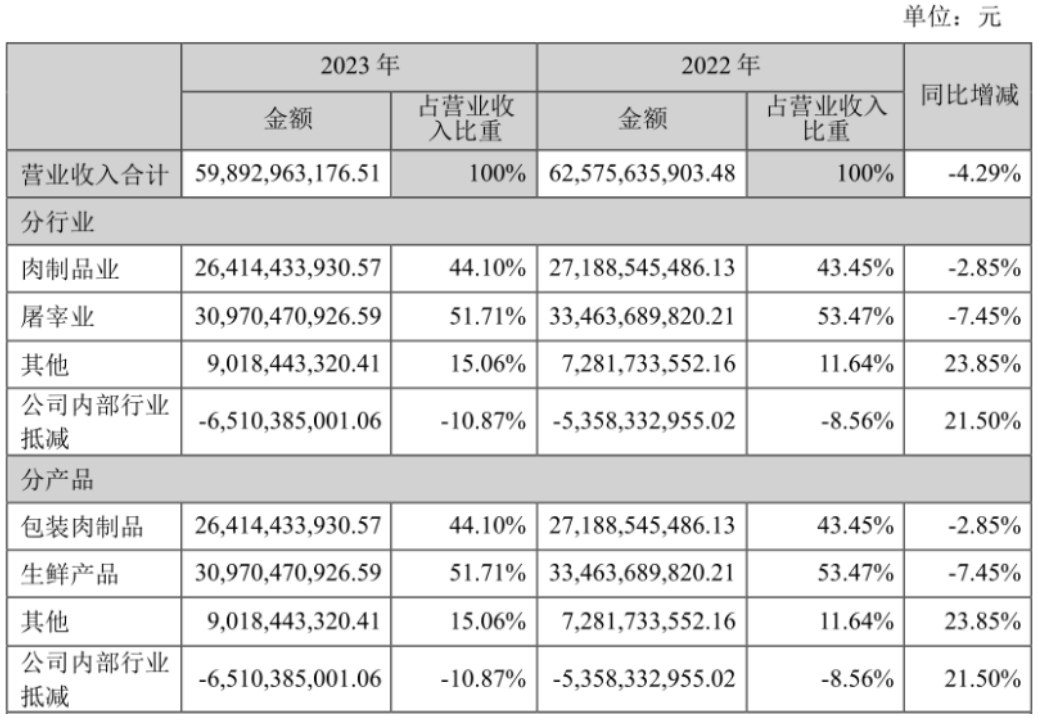 2023年,双汇发展屠宰业务实现营收309.7亿元,同比减少7.45%,收入占比51.71%;肉制品业务实现营业收入264.14亿元,同比减少2.85%,收入占比44.1%;其他业务实现营收90.18亿元,同比增长23.85%,收入占比15.06%。
