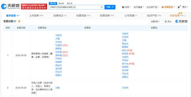 双汇发展(000895)近日发生工商变更,万隆卸任法定代表人,由万宏伟接任。天眼查App同时显示,多位高管同期发生变更。
