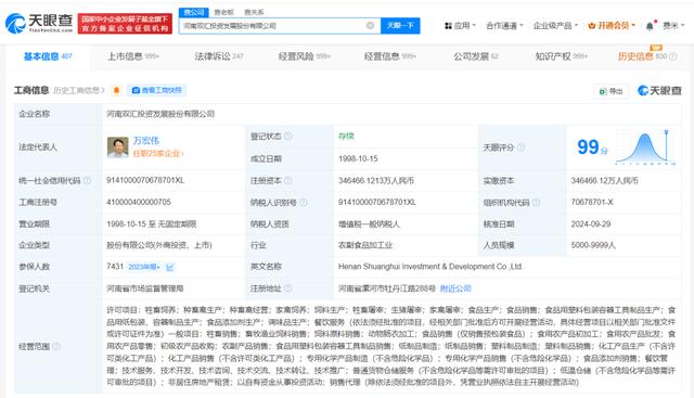 河南双汇投资发展股份有限公司成立于1998年10月,注册资本约34.6亿人民币,经营范围含牲畜饲养、种畜禽生产、食品生产、食品销售等,由罗特克斯有限公司、香港中央结算有限公司、中国证券金融股份有限公司等共同持股。