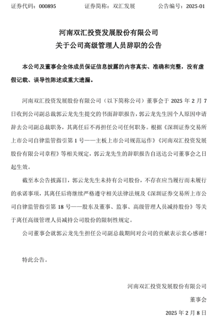 2月7日,河南双汇投资发展股份有限公司(000895.SZ)董事会收到副总裁郭云龙提交的书面辞职报告。郭云龙因个人原因申请辞去公司副总裁职务,离任后不再担任公司任何职务。根据《深圳证券交易所上市公司自律监管指引第1号——主板上市公司规范运作》及《河南双汇投资发展股份有限公司章程》相关规定,其辞职报告自送达董事会之日起生效。