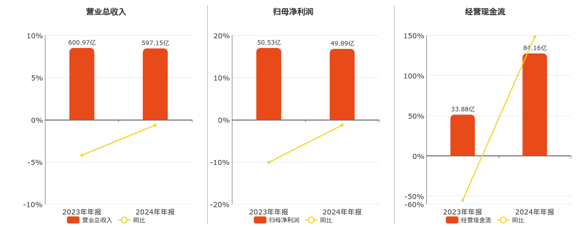 公司营业总收入为597.15亿元,较去年同报告期营业总收入减少3.82亿元,同比较去年同期下降0.64%。归母净利润为49.89亿元,较去年同报告期归母净利润减少6369.37万元,同比较去年同期下降1.26%。经营活动现金净流入为84.16亿元。