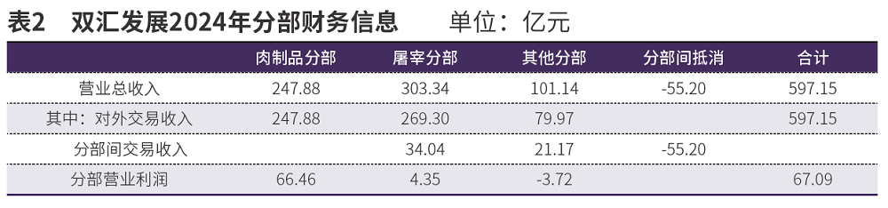 双汇发展的经营业务分为肉制品分部、屠宰分部和其他分部。其中,肉制品分部主要进行包装肉制品及配套行业生产、销售等业务;屠宰分部主要进行生猪屠宰及销售,进口猪肉贸易等业务;其他分部主要包括家禽及生猪养殖、禽类屠宰及销售、非猪肉类产品进口贸易、商业零售、调味料及包装物的生产销售、金融服务等业务。
