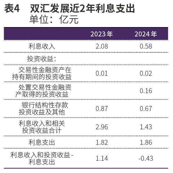 从整体来看,双汇发展这样做在2024年未必划算——2023年,公司的利息收入和相关投资收益减去利息支出数为1.14亿元,而2024年为-0.43亿元。
