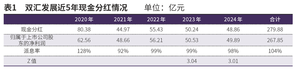对中国恒大来说,累计分红金额和债务金额甚至不在一个数量级上。双汇发展的情况与此迥异——仅近5年,公司就分红279.88亿元,而在2024年末,其总负债只有159.60亿元。