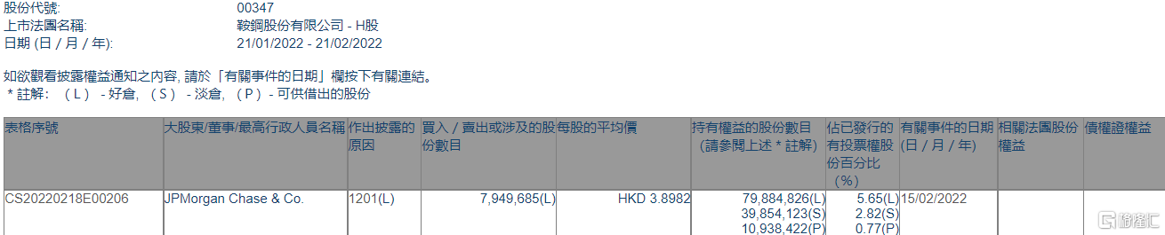 格隆汇APP获悉,根据联交所最新权益披露资料显示,2022年2月15日,鞍钢股份(00347.HK)遭JPMorgan Chase & Co.以每股均价3.8982港元减持好仓794.97万股,涉资约3098.95万港元。
