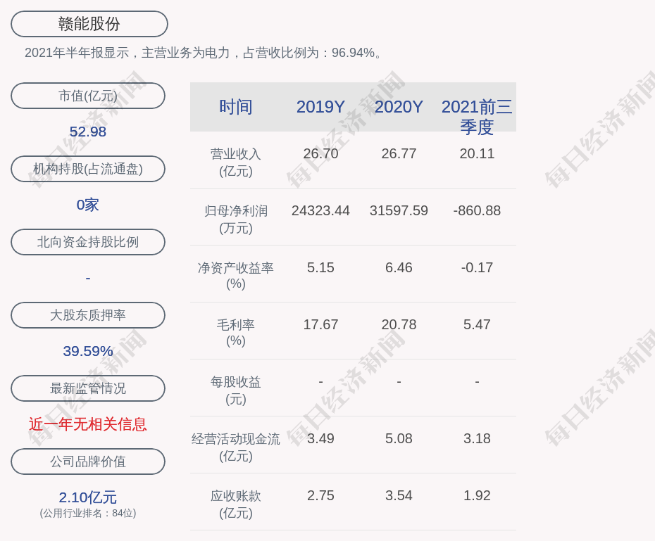 2021年半年报显示,赣能股份的主营业务为电力,占营收比例为:96.94%。