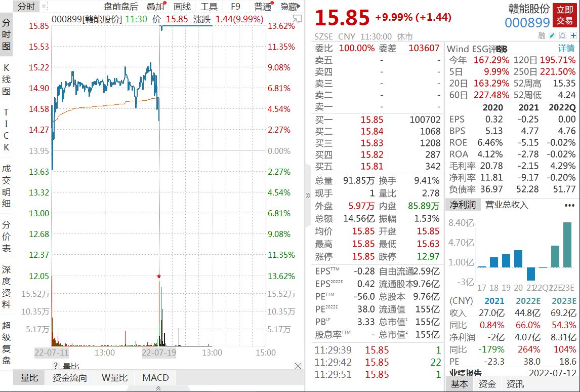 7月19日,赣能股份复牌,开盘即一字涨停,截至午间收盘,该股报15.85元,涨停板上封单超10万手。