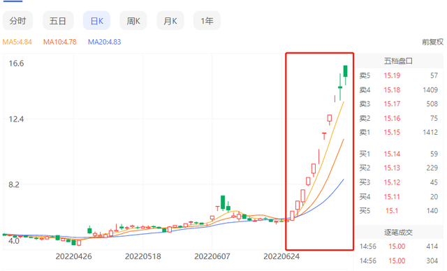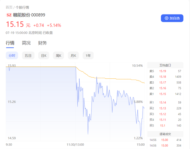 7月19日,赣能股份在停牌一周后复牌,再度一字涨停,股价报15.85元/股,市值154.6亿元。