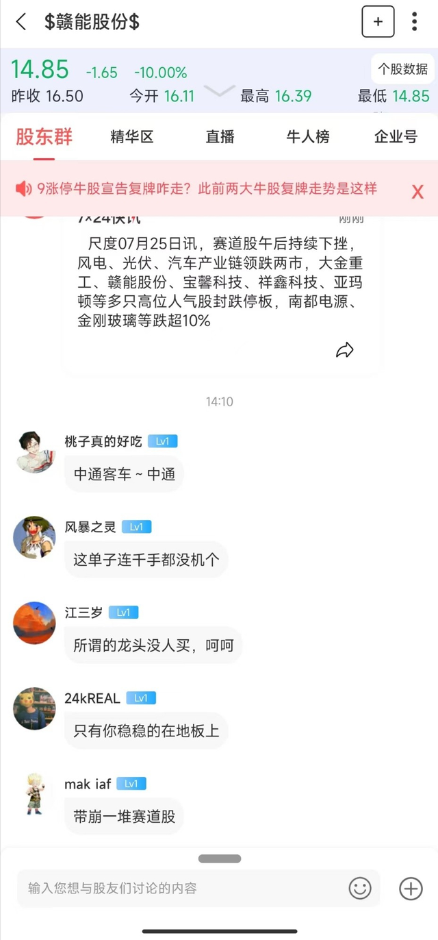 在尺度赣能股份股东群,有投资者表示,今天赣能股份带崩了一堆赛道,所谓的龙头没有人买,尴尬。“其他个股反抽,但赣能是稳稳地趴在地板上。”