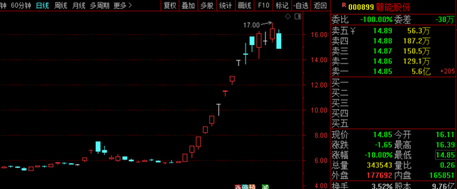 赣能股份作为近期的大牛股,连续9个涨停板,上周五股价最高17元,自6月27日第一个涨停以来,累计涨幅190%。如果按4月27日的4.2元计算,累计涨幅则达到300%。