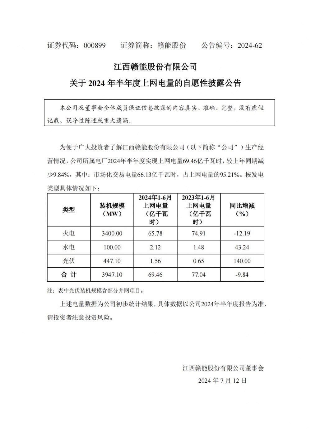 7月12日,赣能股份发布关于 2024 年半年度上网电量的自愿性披露公告。