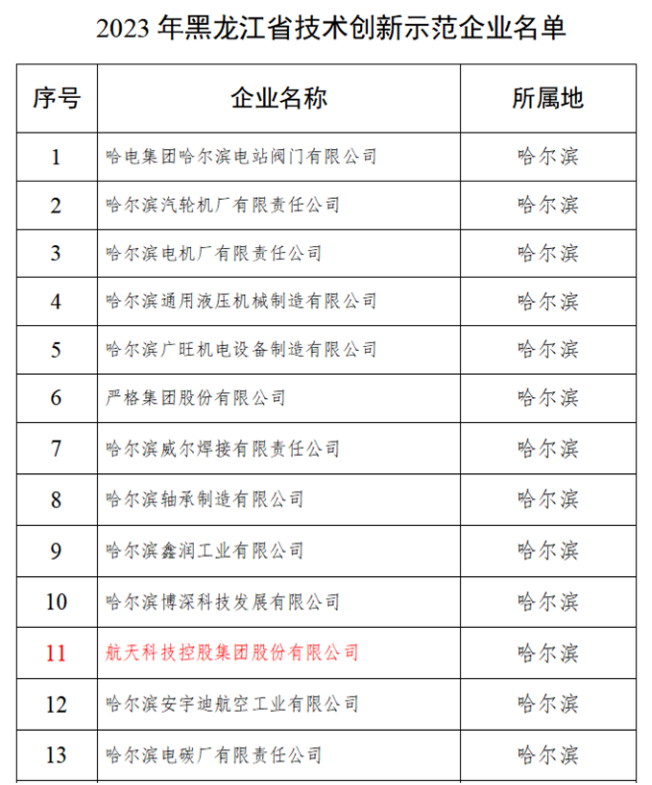 为深入推进实施创新驱动发展战略,加强本省企业技术创新体系建设,大力支持企业增强自主创新能力,根据《黑龙江省技术创新示范企业认定管理办法(试行)》,黑龙江省工信厅于4月10日决定开展2023年度省技术创新示范企业认定工作。航天科技股份公司积极与省市部门沟通协调,认真准备并及时提交申报材料,最终经专家评审,包括公司在内的30家企业通过了黑龙江省技术创新示范企业认定。