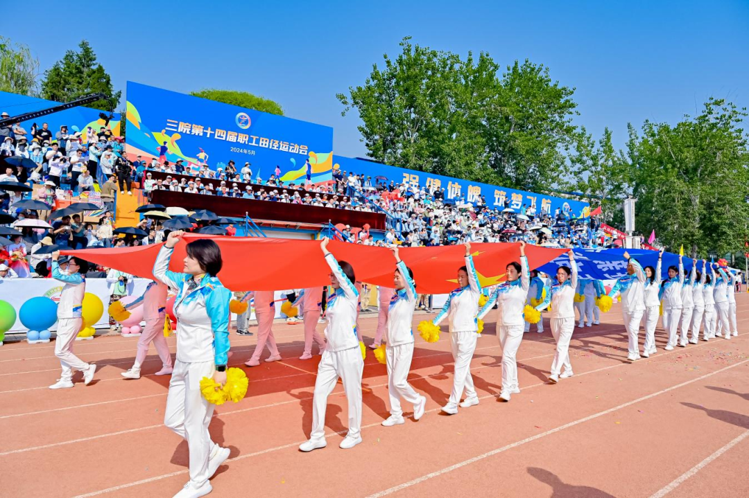 伴随着铿锵有力的《运动员进行曲》,国旗、集团公司司旗、三院院旗、“飞航精神”、“小二黑”精神、“新时代飞航青年特质”文化展板、第十四届运动会会徽方阵依次入场。航天科技代表队方阵迈着整齐的步伐步入运动场,步伐坚定、英姿飒爽的通过主席台接受检阅。