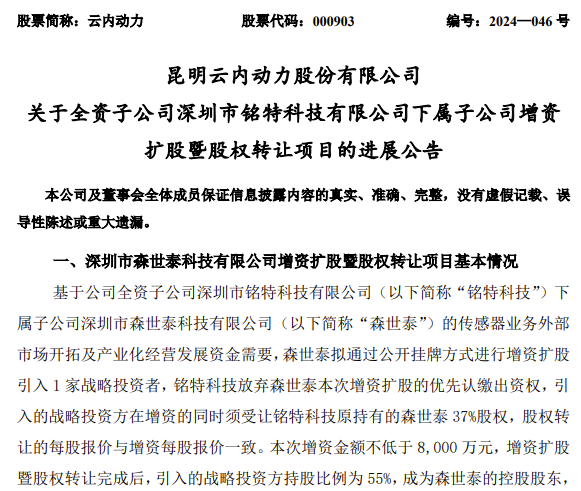 9月10日,昆明云内动力股份有限公司发布关于全资子公司深圳市铭特科技有限公司下属子公司增资扩股暨股权转让项目的进展公告。