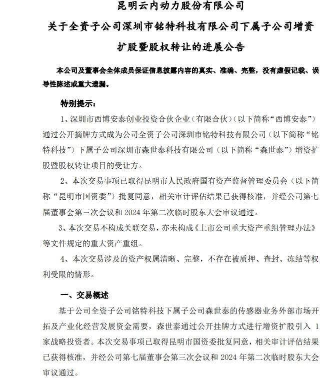 11月12日,昆明云内动力发布公告,介绍全资子公司铭特科技下属子公司森世泰增资扩股暨股权转让进展。