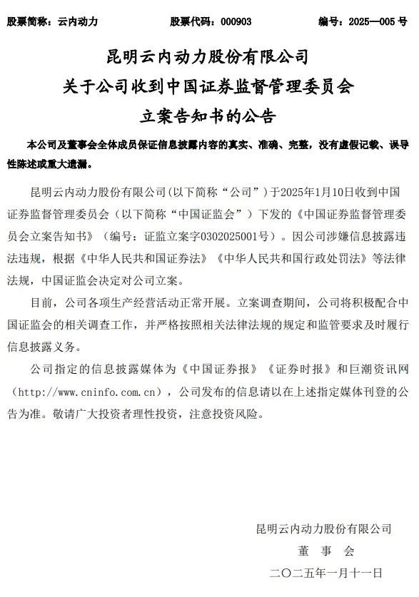 公司主要从事商用车、工程机械设备的发动机生产与销售。财务数据显示:2022至2024年,公司已连续三年亏损。而雪上加霜的是,公司因涉嫌信息披露违法违规,目前已被中国证监会立案。