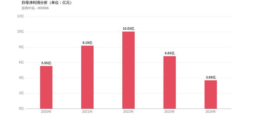 利润角度分析,2020年浙商中拓实现归母净利润5.55亿元,2024年3.69亿元。利润水平在2021年和2022年保持增长态势,但2023年和2024年连续大幅下滑。